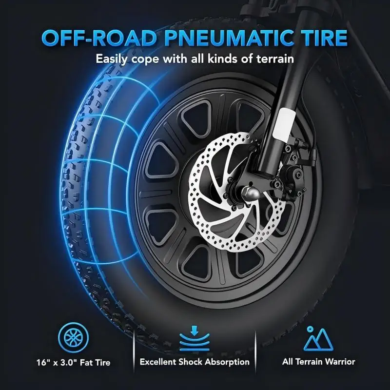 【Sturdy Design】With 16″ x 3″ off-road tires and a sturdy frame, Caroma D1 electric scooter minimizes collisions and supports up to 300 lbs, ensuring stability and durability on all terrains. Suitable for riders of all sizes.